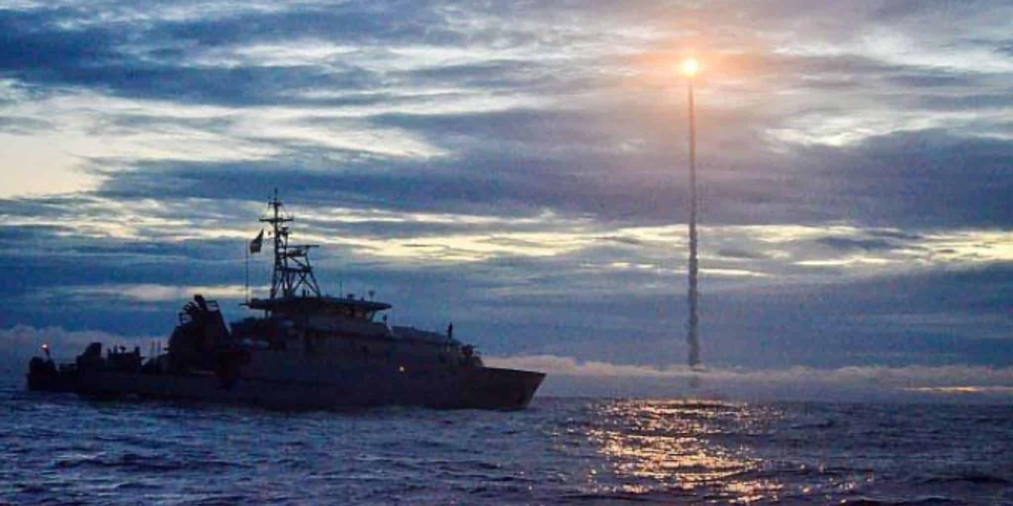 Après plusieurs heures écoulées, aucune menace n’a été détectée cette fois-ci. Les pêcheurs, informés du décollage de la fusée Ariane V, quittent progressivement la zone. Le patrouilleur la Résolue rejoint sa zone assignée située à quelques kilomètres du pas de tir… La séquence se déroule sans accroc et j’imagine, peut-être naïvement, les derniers instants du compte à rebours dans le poste de commandement du centre spatial. Malgré l’heure tardive, l’ensemble de l’équipage s’est rassemblé sur le pont à l’avant du navire.